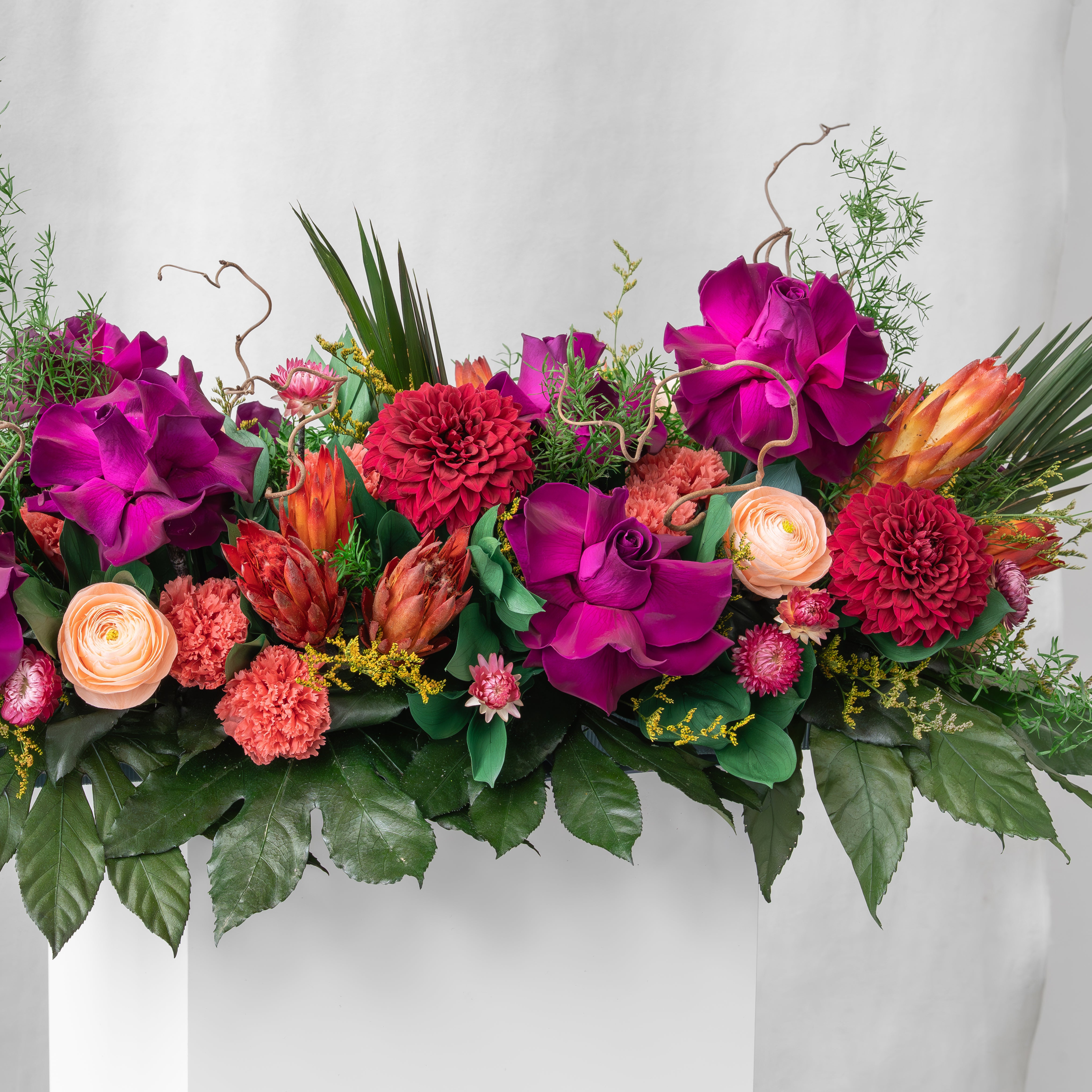 Lucinda is a beautiful long low display bursting with flowers and colour. A modern style incorporating tropical leaves and reflexed roses, vibrant protea, pretty dahlia, ranunculus and finished with carnations. This arrangement is made in a floral tray, keeping it flatter to your display table.